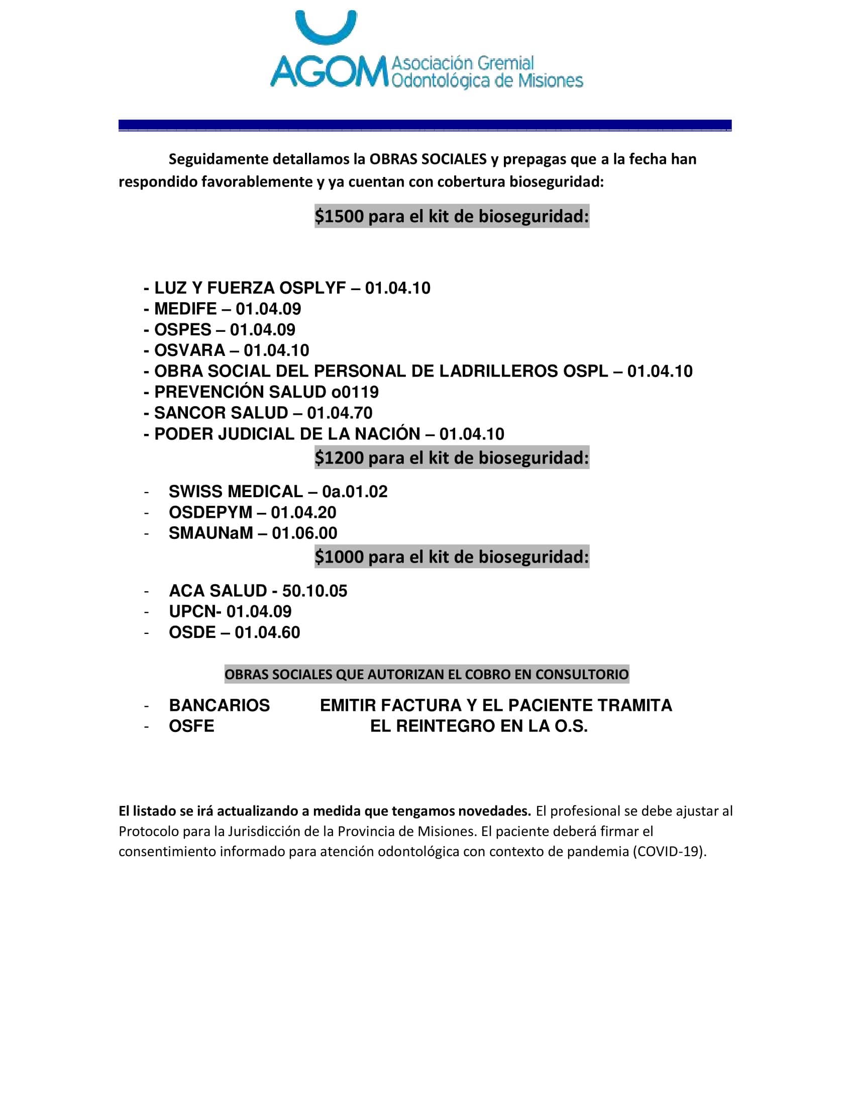 Recordamos señores prestadores que la obra social en su actualización correspondientemente subida a la página a partir del 1 de septiembre, posee cobertura del kit de bioseguridad en su facturación, y ya no se utiliza más la modalidad de reintegro.